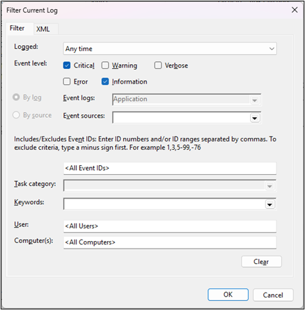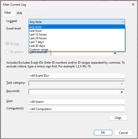 In the newly opened window, you’ll see options you can use to filter the log. The first option is Logged, which refers to the time stamp for the event. Clicking the combo box next to the label allows you to see the existing options for this field: