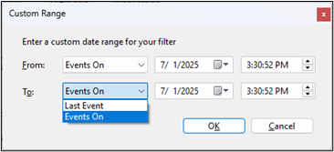 You’ll notice you can’t choose the date and time for the filter. To be able to select the date and time for the “From” time stamp, click on the first combo box and change it to “Event On.” You can also do the same for the second timestamp.