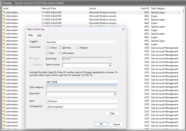 Before covering more advanced techniques, I’ll share a final tip. You can easily include or exclude event IDs. You have to enter IDs separated by commas. To exclude a given ID, start with a minus sign. Ranges also work: you can use a minus sign to separate the first ID from the last.