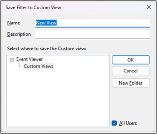 Don’t forget, of course, to change “testuser” to an actual user name, keeping the quotes. Click OK and enter a name and a description for your custom view. Finally, click OK, and your newly created custom view will be added to the list, and you’ll be able to see its results.